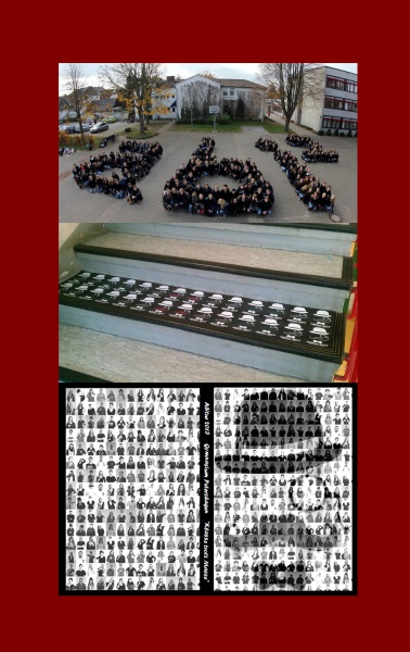 Zu der hochgeladenen Datei: Ganz oben ist ein Foto der Jahrgangsstufe, die sich zu dem Schriftzug 'abi²' formatiert hat, da wir doppelt so viele Schüler wie in einem 'normalen' Abiturjahrgang sind. In der Mitte ist wortwörtlich unsere "Jahrgangsstufe". Mit unseren Abituraufklebern haben wir eine Treppenstufe im Treppenhaus beklebt - und haben damit einen Trend für die nächsten Jahrgangsstufen gesetzt! :) Das unterste Bild zeigt unser Abibuchcover, das aus den Einzelfotos aller Schüler des Jahrgangs zusammengesetzt ist. Sowohl in den Einzelbildern als auch auf dem großen Cover-Bild, dass unsere Bilder formen, setzt sich unser ABI-Motto 'Klasse trotz Masse' in Form eines Bartes fort.
