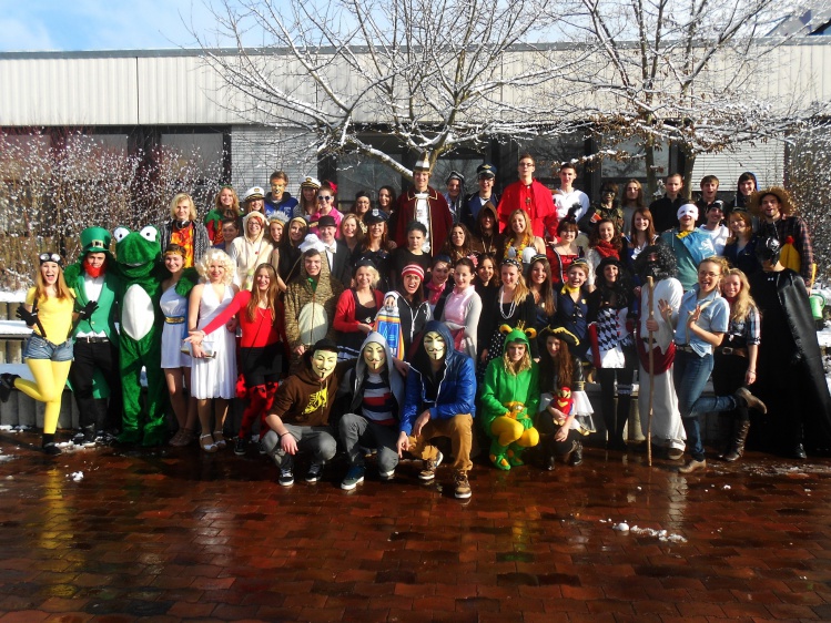 Das Besondere an unserer Stufe ist, dass immer eine gute & ausgelassene Stimmung herrscht, auch wenn man mal verkatert in die Schule kommt. Den Höhepunkt bildet der "Unsinnige Donnerstag"! An diesem Tag im Fasching kommt jeder verkleidet und mit allerlei Getränken ausgerüstet in die Schule. Im Olymp (Oberstufenzimmer), quasi unserem zweiten Zuhause, gehts dann richtig ab! ;) Von lauter Musik über einen Saufspiel-Zirkel ist alles dabei. An diesem Tag wurde auch das mitgeschickte Foto gemacht. Es zeigt uns in unserer vollen Pracht. Mit dieser Stufe macht sogar Schule Spaß! ;)