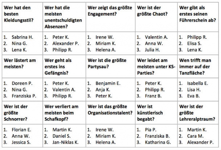 Familiäre Atmosphäre pur und trotzdem haben wir von allem etwas dabei (: Ein kleiner Haufen Elitelateiner, eine Hand voll Franzosen voller Esprit, die größten Sportskanonen im ganzen Landkreis, die besten Gerüchte, die lustigsten Lehrer – das ist unser geliebtes RSG! Egal um was es geht, wir diskutieren gerne und viel. Da kann es schon mal sein, dass die Q12 Sitzungen mehrere Stunden dauern – doch nach langen Streitereien herrscht dann bald mal wieder Friede, Freude, Eierkuchen! Im Anhang schicke ich euch unsere aktuelle Statistik mit – damit wird die Vielfalt unserer Q12 deutlich :) ”
